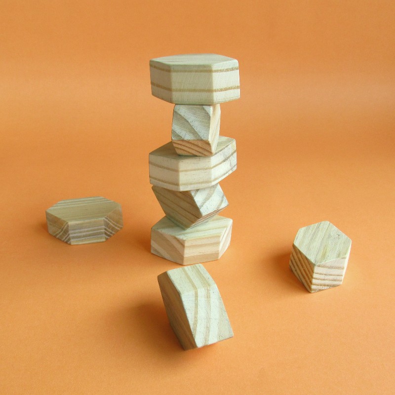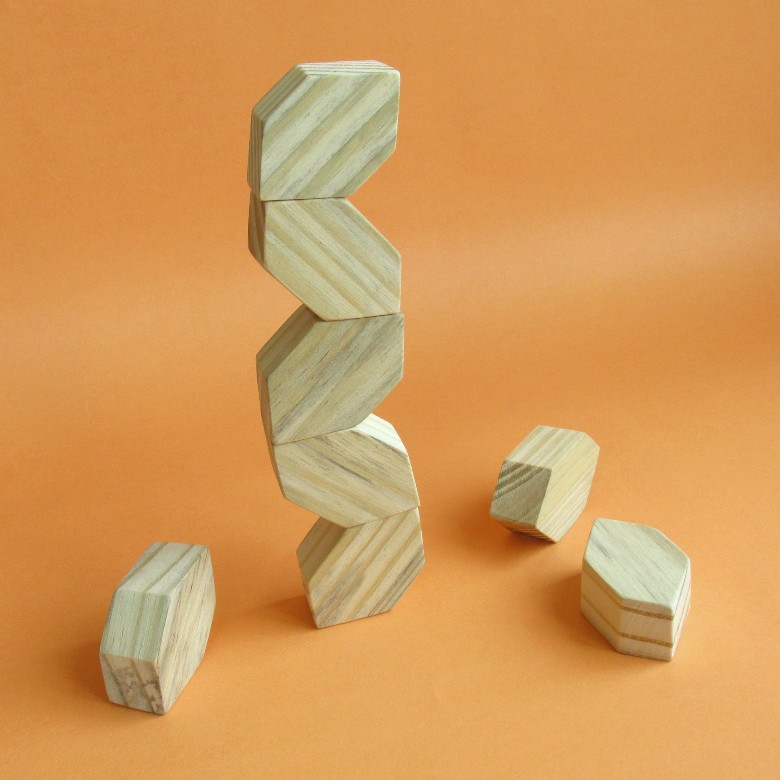 As peças do “Empilha ou tomba?” possuem ângulos diferentes uns dos outros, dando dinâmica à brincadeira e oferecendo diversas possibilidades de brincar.