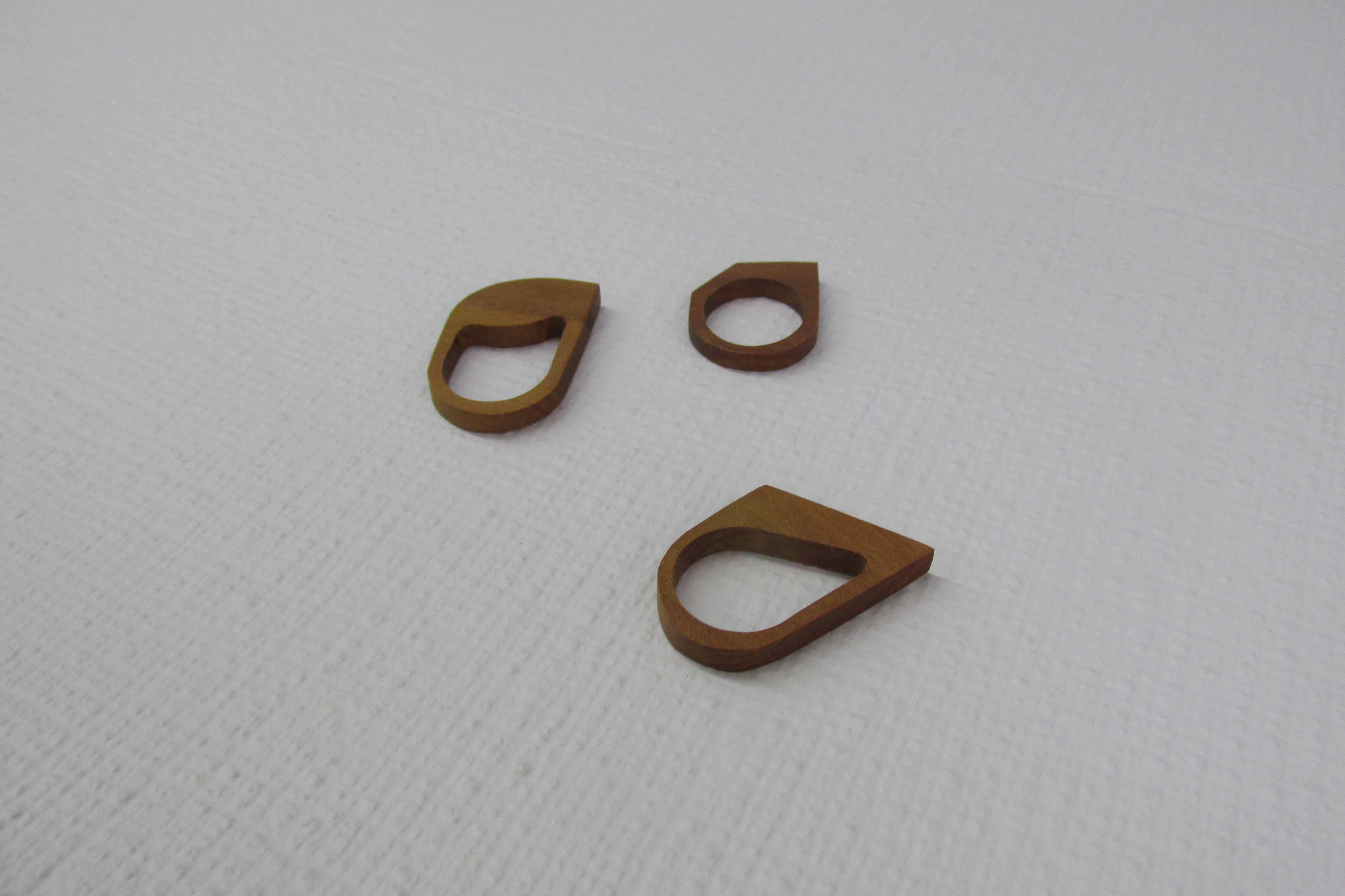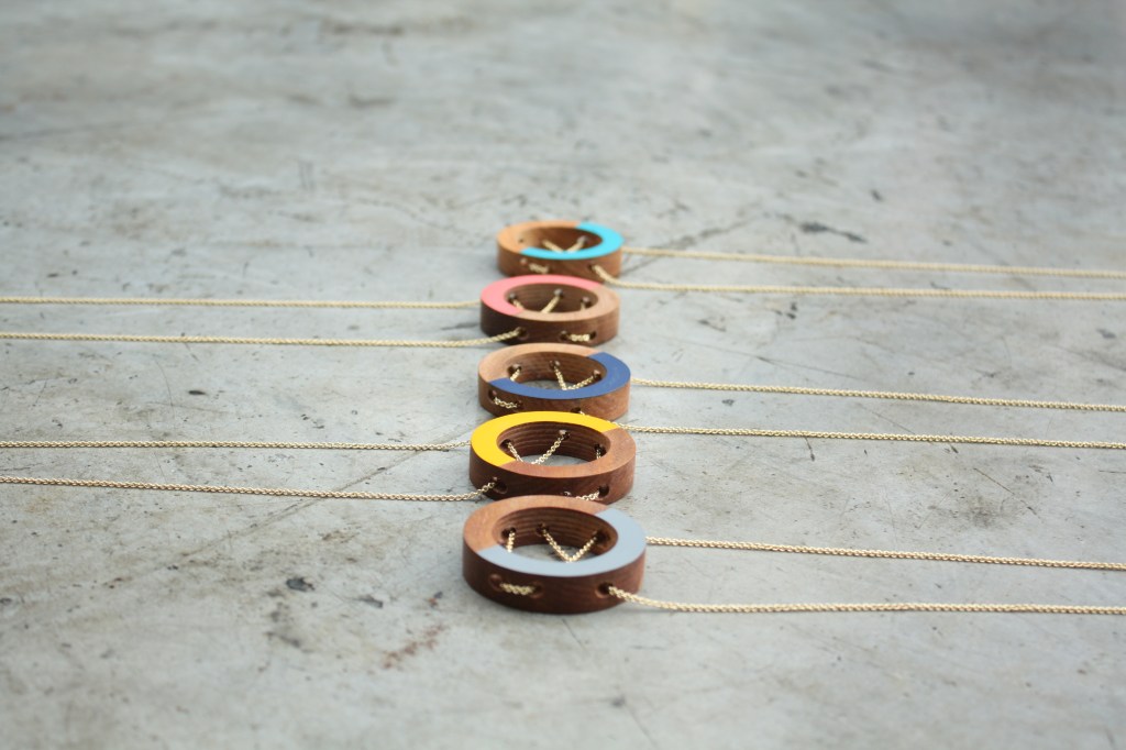 A coleção de joias contemporâneas Madê é composta por colares, brincos e anéis produzidos em madeira peroba.